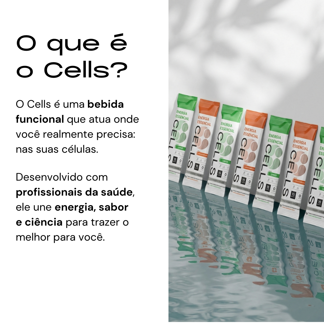 A cells é um energético premium em sticks, formulado com cafeína natural, vitaminas, minerais e aminoácidos para entregar energia limpa, constante e prolongada, sem picos, sem efeito rebote e sem ingredientes artificiais.